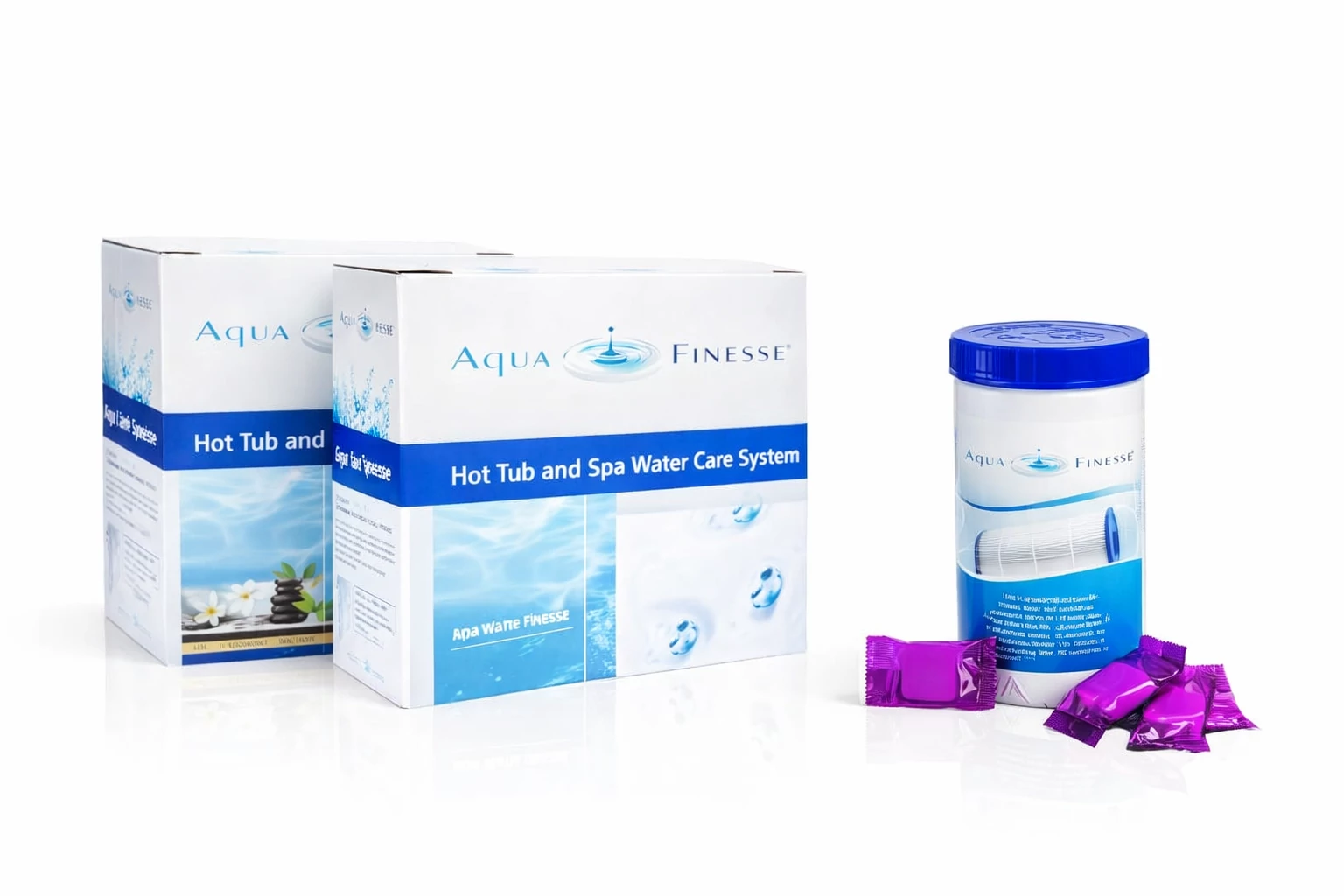 Az AquaFinesse™ egy szabadalmi oltalom alatt álló medencék tisztítására szolgáló víztisztító adalékanyag, amely legkényelmesebb módja a fürdővíz tisztán tartásának. Nincsenek a szokásos kemikáliák, csupán a kristálytiszta vizet ígérő környezetbarát, modern adalék. Az AquaFinesse™ egy pofonegyszerűen használható termék, amelynek használata csupán heti egyszeri alkalommal néhány perces művelet. Az AquaFinesse™ segít abban, hogy időt takarítson meg, és ne költse pénzét feleslegesen a masszázsmedence vegyszerek különböző formáinak folyamatos tesztelésével. Meggyőződésünk, hogy az AquaFinesse™ az egyetlen igazán egyszerű megoldás a jakuzzik vízkezelésében. A szokásos napi szintű odafigyelés helyett elegendő hetente egy alkalommal foglalkoznia a medencevíz karbantartásával, és folyamatosan kellemes, kristálytiszta vízben fürdőzhet. Az AquaFinesse™ használata a medencevíz fertőtlenítő szer igényét jelentősen csökkenti, így elegendő csupán a lassan oldódó fertőtlenítő (triklór) tabletta használata.