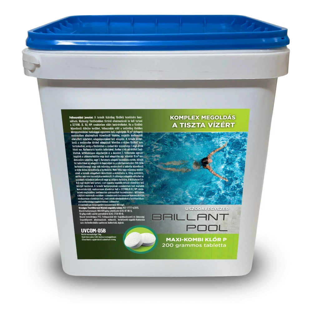 Alkalmazása: PVC fólia burkolatú/anyagú vagy más műanyag medencénél a tabletta közvetlenül a vízbe dobva károsíthatja a burkolatot, kéthetente a szkimmerkosárba vagy az úszóadagolóba helyezendő a tabletta (15 m3 medencevízre számítva).