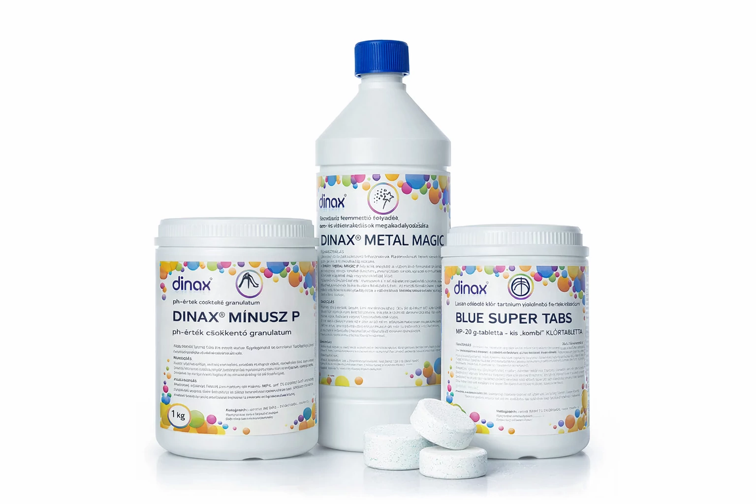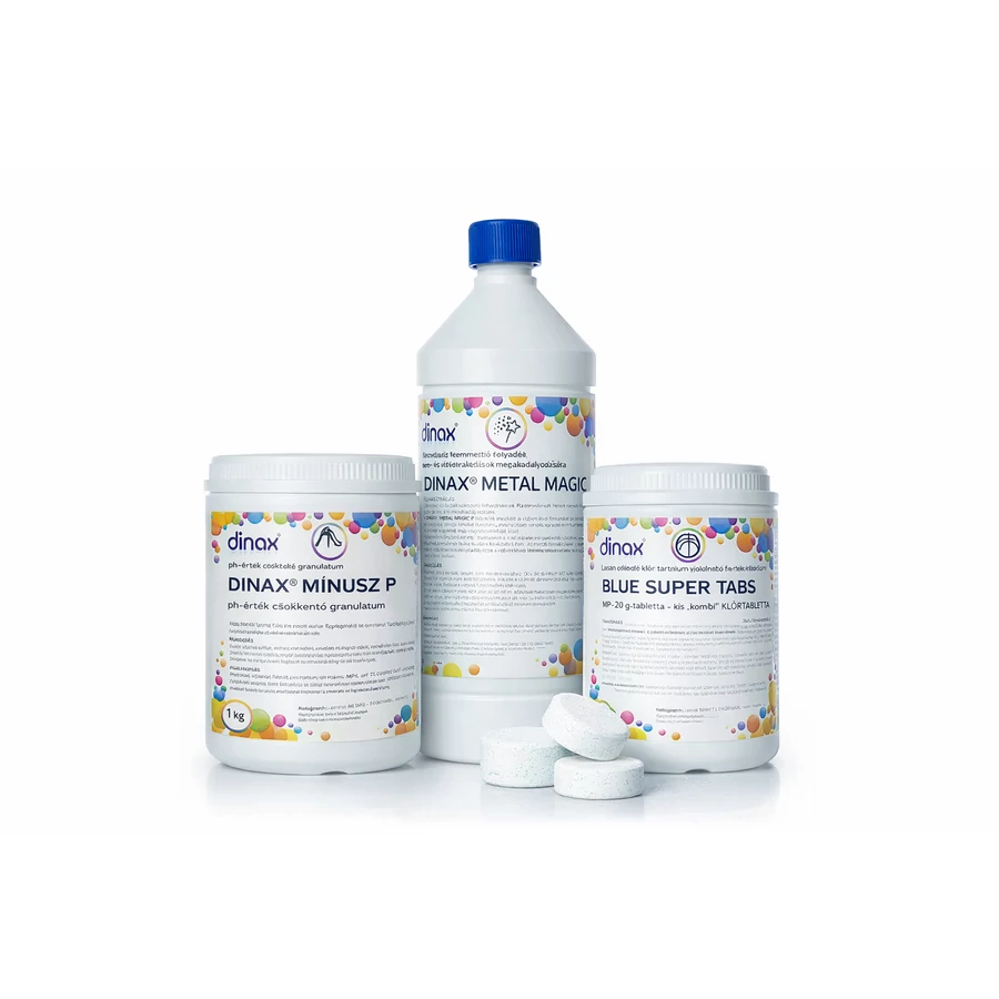 A Dinax Gyors Megoldás Csomag minden alapvető vegyszert tartalmaz, amely szükséges a medence vagy jakuzzi vízének tisztán tartásához.